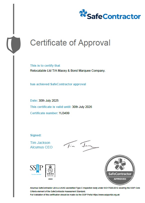Our working practices and procedures conform to the MUTAmarq guidelines for events in temporary structures, and our company’s Health & Safety has been assessed and accredited by Safecontractor, a member of the SSIP (Safety Schemes In Procurement).